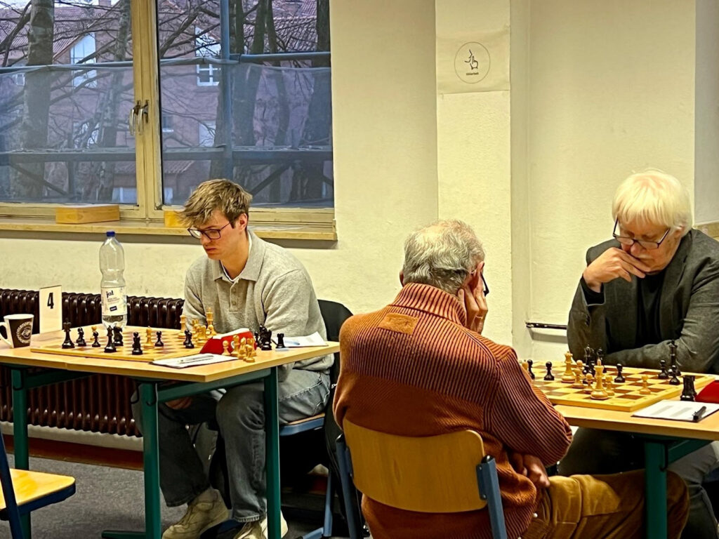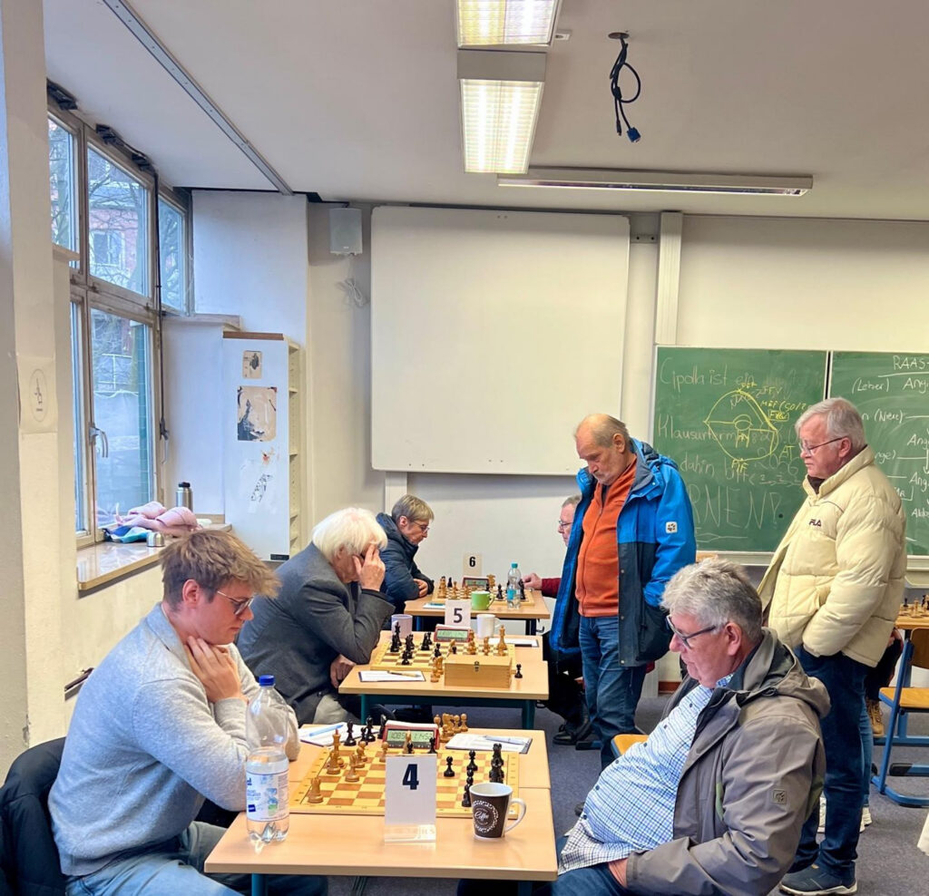 Bei Außentemperaturen um den Gefrierpunkt und innen gefühlt im einstelligen Bereich mochte man sich nicht so recht von den Jacken trennen. Alle zogen die Figuren schnell übers Brett, wodurch es nach ein paar Minuten etwas wärmer wurde. Am Spitzenbrett war ich noch mit meiner Cambridge-Springs-Verteidigung beschäftigt, als ich am Nachbarbrett die freundschaftliche Konversation wahrgenommen habe. Daniela und ihr Gegner haben sich nach vier Zügen und zehn Minuten auf Remis geeinigt. Als hätte Bahram sich vom Rauch der Friedenspfeife angesteckt, remisierte er zwei Minuten später auch. 1:1 nach nicht einmal eine Viertelstunde.